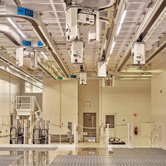 图3 : 目前在半导体机器人市场,仅次于超洁净环境下使用的真空机器人,便是在无尘室内的晶圆搬运设备,若搬送距离较长,半导体物料搬运系统便会利用OHT空中走行式搬运系统。(source:static01.nyt.com)