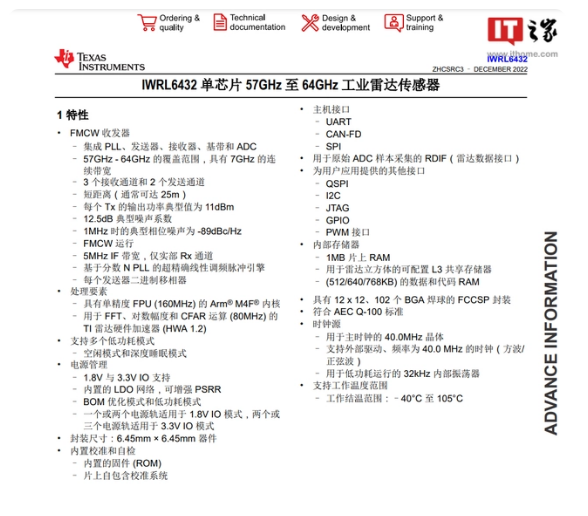 2 月 8 日消息,德州仪器近期发布了低功耗 60GHz 毫米波雷达传感器 IWRL6432 和 AWRL6432。基于雷达的传感器集成电路 (IC) 得益于其远距离探测能力、高运动灵敏度和隐私保护的特性,成为一种常用的传感技术。凭借其高精度,雷达传感器广泛的应用在在汽车和工业市场中,例如盲点检测、碰撞检测、人员存在和运动检测等应用。