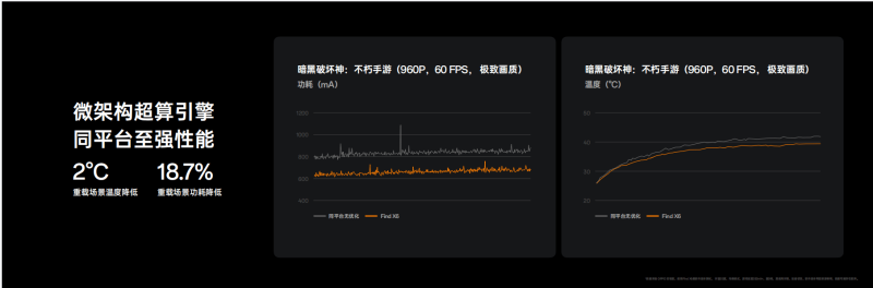 并且,在OPPO的微架构超算引擎加持下,于《暗黑破坏神:不朽》手游960P极致画质、60帧模式下测试,OPPO Find X6功耗最多可降低18.7%,温度可降低2℃。可见,搭载天玑9200的OPPO Find X6可以带来极致流畅、酣畅到底的游戏体验,让玩家沉浸式享受游戏乐趣。