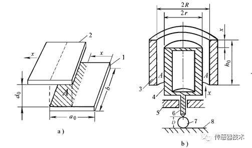 图a是平板形直线位移式结构,其中极板1可以左右移动,称为动极板。极板2固定不动,称为定极板。图b是同心圆筒形变面积式传感器。外圆筒不动,内圆筒在外圆筒内作上、下直线运动。