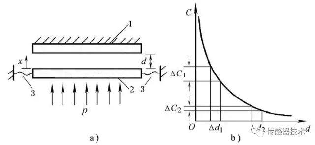 由于被测物体的功效导致动极片偏移,影响了两极板之间的距离d,从而使容量发生变化。