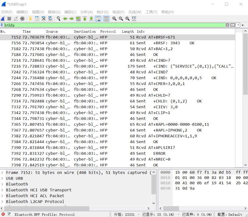 由于HFP都是基于rfcomm的,如果我们也同时希望查看rfcomm 协议,只需要在过滤器里面将 HFP与rfcomm通过 “||” 连接即可。 更详细的使用方法可查看Wire shark的过滤器官方文档说明。