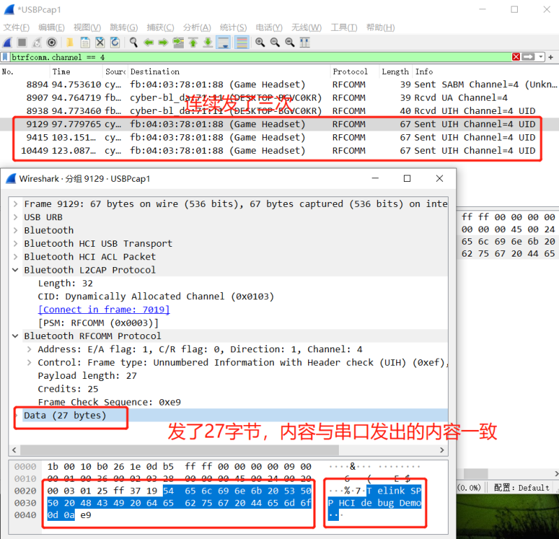 4、抓取完HCI数据包后,通过 btrfcomm.channel == x 来过滤SPP包。这里的x是我们SPP的rfcomm channel,通过SDK代码“#define SPP_CFG_SERVER_CHANNEL 0x04”得知 channel为4;