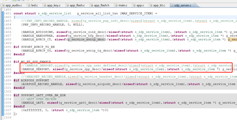 为方便演示,我们在编译双模低延时Headset工程前(以下统称Headset),需要先使能 MY_BT_SPP_ENABLE,再将SPP的Service class ID设置为 0x1101(修改为图1所示即可)。