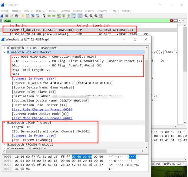 而ACL packet Data部分的内容为L2CAP数据包,通过 DATA packet format(如图7)(BLUETOOTH CORE SPECIFICATION Version 5.2 | Vol 3, Part A page 1034 ) 可知HCI ACL data部分前两个字节为Length,后两个字节为Channel ID。Channel ID是在L2CAP Connect时分配的,可以看到Wire shark已提示这是建立的PSM为RFCOMM的L2CAP。而基于L2CAP的上层协议,Wire shark此时也已经解析完整了。