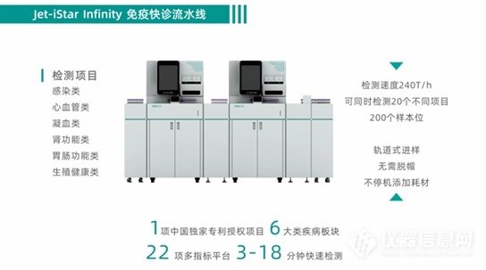Jet-iStar Infinity由两台Jet-iStar Max和轨道模块连接组成,是中翰生物推出的首条全自动免疫快诊流水线。检测项目覆盖感染、心血管、凝血、生殖健康、肾病、胃肠功能6大类板块。其中肝素结合蛋白(HBP)已获中国发明专利ZL200880019915.X许可授权、中国发明专利ZL202010750016.X授权。