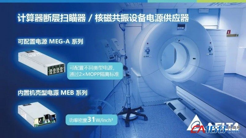 计算器断层扫描器、核磁共振等大型医疗设备检测时会进行一定时间的高速旋转,需要大功率、稳定、且可适应设备运作的电源。