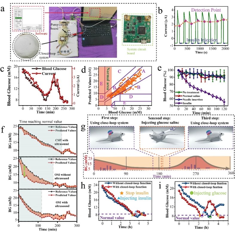 北京大学“精准医学生物传感器”团队研制了糖尿病智能闭环皮肤贴,皮肤贴纽扣大小,极大地降低了目前商用闭环系统的整体体积和价格,致力于实现中国糖尿病患者人人用得起的目标。糖尿病闭环皮肤贴含有微型糖尿病传感器及微型胰岛素注射泵,传感器及注射泵均有电学信号控制,可以精准、同时、实时连续地进行血糖检测及注射胰岛素的功能,并通过血糖浓度的高低,智能精准控制胰岛素注射量和注射速度,稳定血糖浓度。用于与皮肤共形接触的装置的柔性特性使得装置可佩戴并降低感测信号的噪声。皮肤贴采用材料的生物可降解特性使该设备佩戴更安全。闭环贴片是小型化的、可穿戴的、无痛的、重量轻的、具有成本效益的。并且该系统对糖尿病大鼠实现了有效的治疗,在糖尿病大鼠中实现了稳定的血糖浓度控制。
