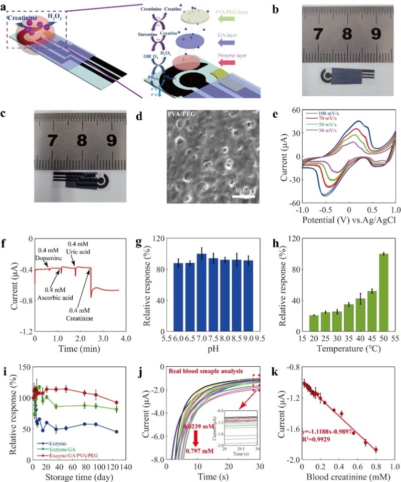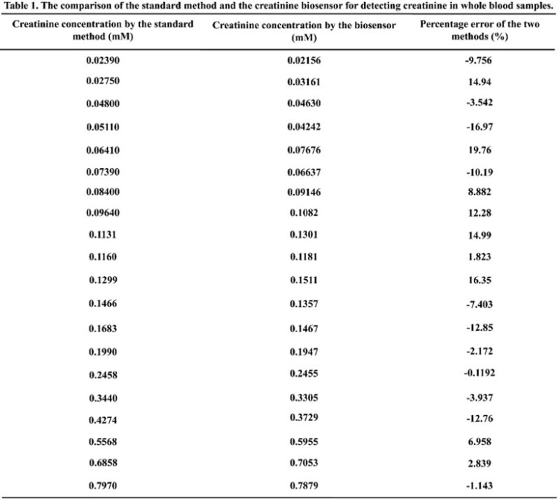 北京大学“精准医学生物传感器”团队研制了肾病肌酐生物传感器,生物传感器具有检测速度快、低成本和尺寸便携等优势,该传感器可以在0.05—1.4mM的线性范围内确定肌酐浓度,对临床血液样本的检测,该传感器性能与医院广泛使用的Jaffe方法相似。另外,基于酶的肌酐传感器在储存过程中稳定性差,限制了其实际应用。为了将这些传感器应用于实际临床患者,研究团队研究了酶在电极上的固定方法,肌酐生物传感器在室温下的储存稳定性显著提高,可以在4个月以上保持传感性能不会显著下降。在临床样品检测中,传感器可以探测血液样本中的肌酐,相对误差在20%以内,和医院检测结果具有高度一致性,并且仪器小型、廉价、可携带,可用于居家使用以精准管理疾病的发展过程。