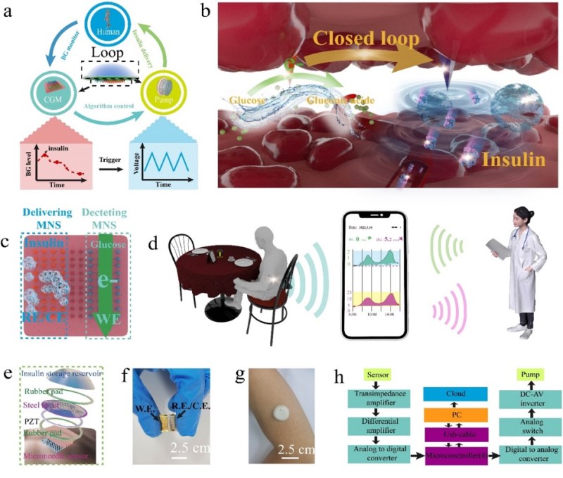 中国是糖尿病第一大国。糖尿病是一种慢性代谢性疾病,当胰腺无法产生胰岛素或当身体无法使用其产生的胰岛素来维持人类的血糖平衡时。血糖水平和胰岛素需求受多种因素影响,血糖水平和胰岛素需求的日常变化可能非常大。糖尿病的发展可能导致高血压、脑血管疾病、冠心病、视网膜病变,以及其他并发症。实时检测患者的血糖水平并注射胰岛素以将血糖水平维持在正常范围内,对糖尿病的管理至关重要。长期临床试验表明,加强对糖尿病的控制可以显著降低高血糖并发症的风险,减少住院治疗,节省医疗成本,避免无效药物,并挽救生命。糖尿病的闭环系统可以提供对糖尿病的更强控制,并且它通常包括连续的葡萄糖监测传感器和用于连续输送胰岛素的胰岛素泵。然而,传统的设备装置很大并且非常昂贵。此外,大多数消费者不希望可穿戴设备过于显眼。这些限制了闭环系统在糖尿病患者中的广泛使用,到目前为止,只有极少数糖尿病患者能够使用商业产品。