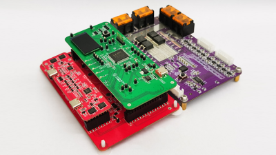 上图所示为广芯微DC-DC数字电源平台Demo板,包含功率板(大红板),DC-DC主控板(绿板),PD接口板(小红板)和BMS板 (紫色板)。