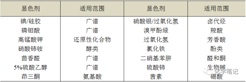 用毛细管把溶解有机物的样品点在薄层色谱板的原点,然后把点有样品的薄层色谱板放置在事先已经加入展开剂的展开槽中展开,等展开剂即将到达薄层色谱板上端之时取出薄层色谱板,吹干展开剂后显色。