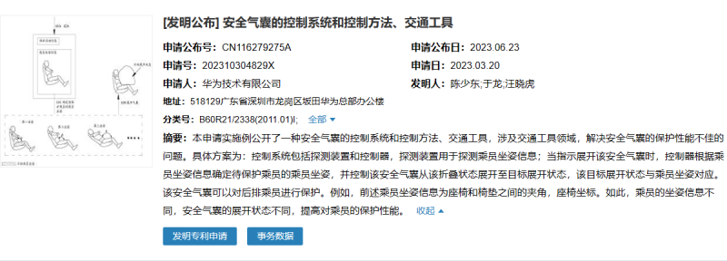 华为安全气囊新专利公布,可根据坐姿调整气囊的展开状态