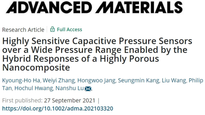 相关工作以“Highly Sensitive Capacitive Pressure Sensors over a Wide Pressure Range Enabled by the Hybrid Responses of a Highly Porous Nanocomposite”为题发表在《 Advanced Materials》。