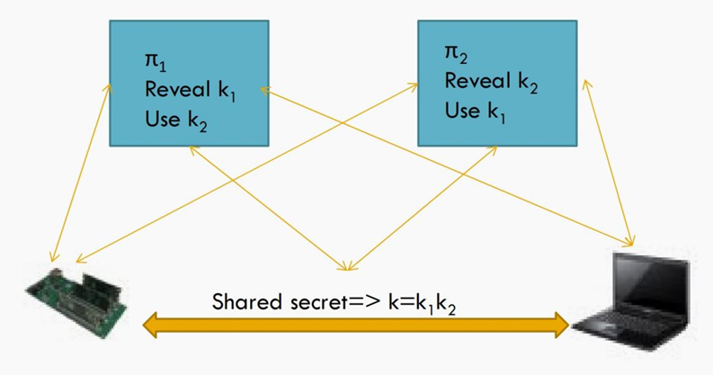 其中,协议π是一个输入为n比特的密钥的安全协议,用户们共享2n比特的密钥k=k1k2