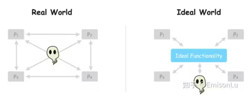 假设存在两个世界,一个理想世界,一个现实世界。现实世界中,协议参与各方交互式地运行协议。在理想世界中,存在一个可信第三方,各个参与方只需把自己的输入交给可信第三方,由可信第三方完成计算,并将结果返回给各参与方。