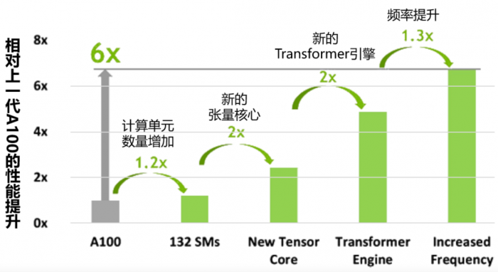 总体而言,基于Hopper架构的H100计算性能比Ampere架构的A100提高了大约6倍。