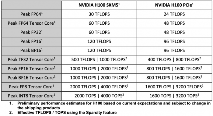 H100 Tensor Core GPU的性能规格