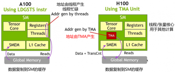 Hopper架构的H100的基于TMA的存储复制效率更高