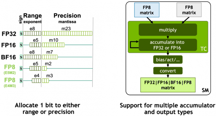 Hopper架构的新一代流式多处理器引入了FP8张量核心(Tensor Core)来加速AI训练和推理。FP8张量核心支持FP32和FP16累加器,以及两种FP8 输入类型(E4M3和E5M2)。