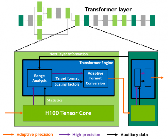 为了提升Transformer的计算效率,在这一新的Transformer引擎中使用了混合精度,在计算过程中智能地管理计算精度,在Transformer计算的每一层,根据下一层神经网络层及所需的精度,在FP8和其他浮点格式中进行动态格式转换,充分运用张量核心的算力。