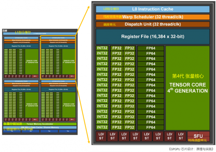 每个SM包括128个FP32 CUDA核心、4个第4代张量核心(Tensor Core)。