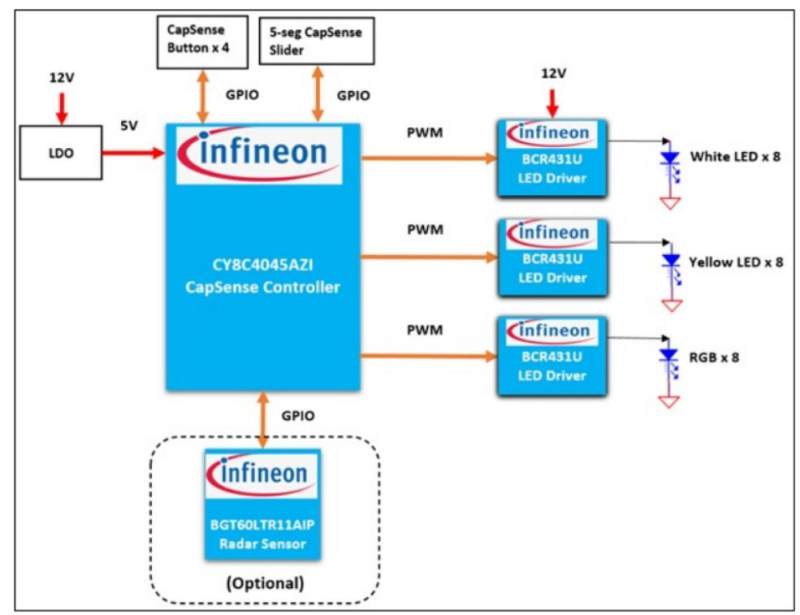 近年来,电容触摸控制在各类灯具市场广受欢迎。它通过人体触摸导电来实现对灯具的智能控制。作为开关的一种,该控制方式最重要的优势之一是防止污垢和湿气进入产品使其粘连或损坏。由大联大品佳基于Infineon PSoC 4 CapSense控制器(CY8C4045SAZI)、BGT60LTR11AIP微波运动传感器、BCR431U LED驱动器推出的电容触摸感应台灯方案具有较好的灵敏度和稳定性,可以在各种环境下稳定工作。