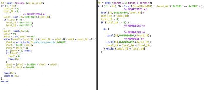 设备擦除代码:写入 ox40000(左)或使用 MEM*IOCTLS(右)