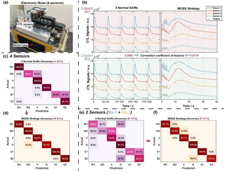 该研究中,研究者也针对不同烈酒种类辨识展开探究。研究者在4个CTL传感器组成的电子鼻上对6种烈酒展开检测,分别使用传统单次进样方法与MOSS策略进行采样。实验证明,相较于传统单次进样方法,MOSS策略可将该电子鼻设备对6种烈酒的辨识准确度从81.94%提升到95.83%,能够实现对不同烈酒种类的高准确度辨识。进一步实验表明,在仅有2个CTL传感器检测6种烈酒的限制条件下,传统单次进样方法的电子鼻仅能实现61.11%的辨识准确度,而MOSS策略可使该电子鼻实现91.67%的辨识准确度。以上实验说明了MOSS策略对电子鼻气味辨识能力的显著提升效果。
