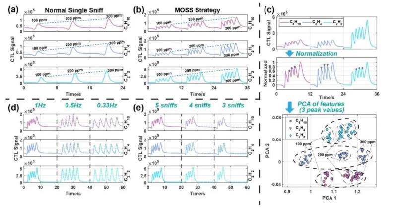 该研究首先针对挥发性有机物气体(VOC)辨识进行探究。研究者在单个CTL传感器上对三种不同浓度的VOC气体(乙烯、乙炔、丁烷)展开检测,分别使用传统单次进样方法与MOSS策略进行采样。实验表明,在传统气体进样方法下,该CTL传感器响应幅值与气体浓度成正比,而无法提取有效的VOC种类信息。在所提供的MOSS策略下,该CTL传感器的时序信号波形具有明显的区分度。实验证明,将时序信号的相对峰值作为特征向量,可直接通过主成分分析同时辨识VOC气体种类与浓度,而无需额外的机器学习算法。