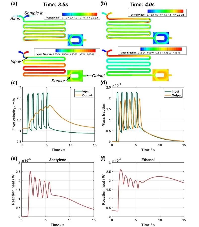 针对MOSS策略的动力学原理,该研究进行了计算流体动力学仿真验证。验证结果说明,由于同一CTL传感器对不同气体成分的响应方程及参数并不相同,这一差异在MOSS策略引发的动态气流下会直接导致时序传感信号的波形差异,从而有助于模式识别算法从传感信号中提取特征数据并辨识不同气体成分,这为该研究所提的MOSS策略提供了明确的理论依据。