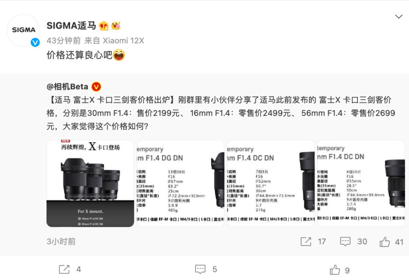 适马富士 X 卡口三剑客价格出炉:2199 元起