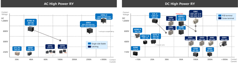 G9KB-E是G9KB系列的高容量型号,虽然其尺寸和重量与G9KB标准型相同,但将最大开关电压扩展到800V DC,最大载流电流扩展到100A。DC800V 50A和DC600V 100A的额定值特别适合储能系统和EV充电器/V2X等15-40kW级蓄电池相关应用。
