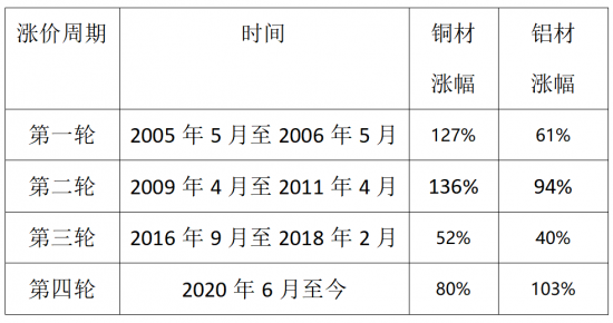 产业在线空调研究组相关负责人在接受《中国电子报》记者采访时表示,历史上共出现过三轮铜铝原材料上涨周期,最近一次出现在2016年。而本轮铜铝原材料涨价周期已经超过18个月,为历史最长。
