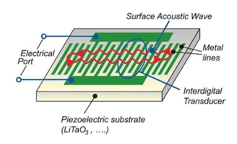 滤波器(SAW、BAW、FBAR等),负责接收通道的射频信号滤波,将接收的多种射频信号中特定频率的信号输出,将其他频率信号滤除。以SAW声表面波为例,通过电磁信号-声波-电磁信号的两次转换,将不受欢迎的频率信号滤除。