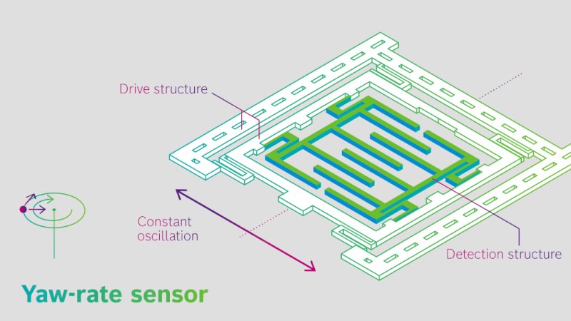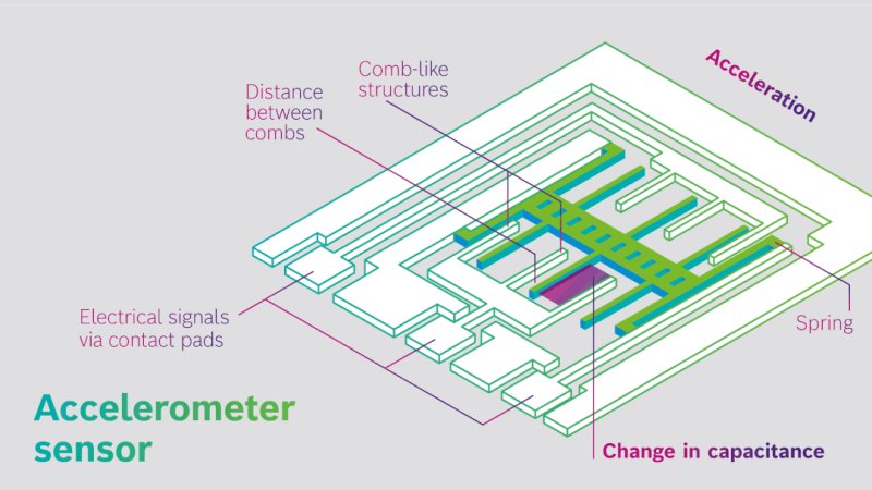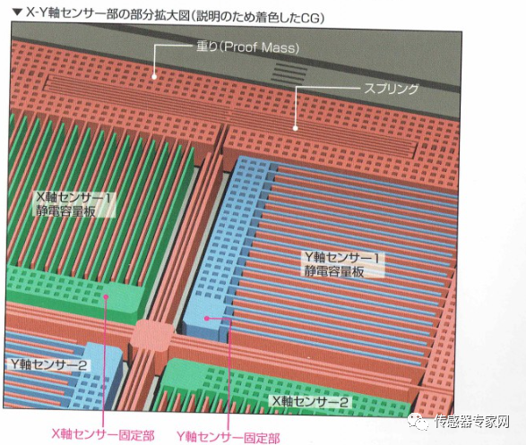 下图来自博世,但物体产生加速度时,带动梳妆结构产生位移,使梳妆结构间电容改变,从而测量出加速度值。