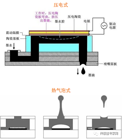 简单点说,喷墨打印头的作用是挤出墨汁,有的是利用压电薄膜震动来挤压墨水,有的是利用加热气泡变大,将腔体内的墨汁挤出。