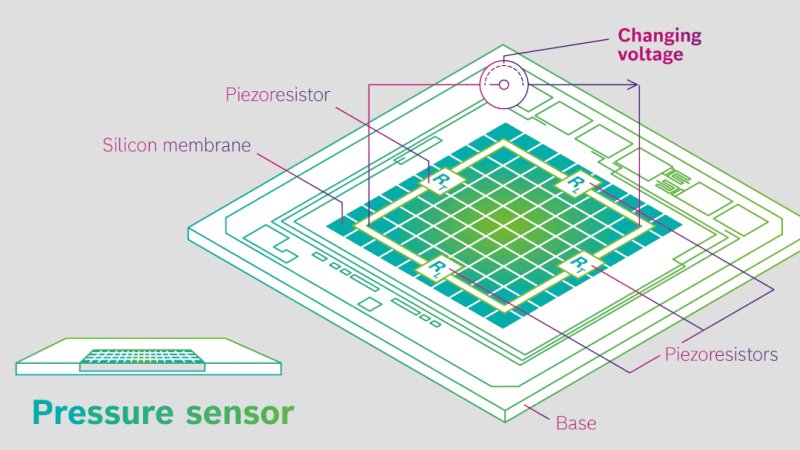 MEMS压力传感器的原理也非常简单,核心结构就是一层薄膜元件,受到压力时变形,形变会导致材料的电性能(电阻、电容)改变。因此可以利用压阻型应变仪来测量这种形变,进而计算受到的压力。