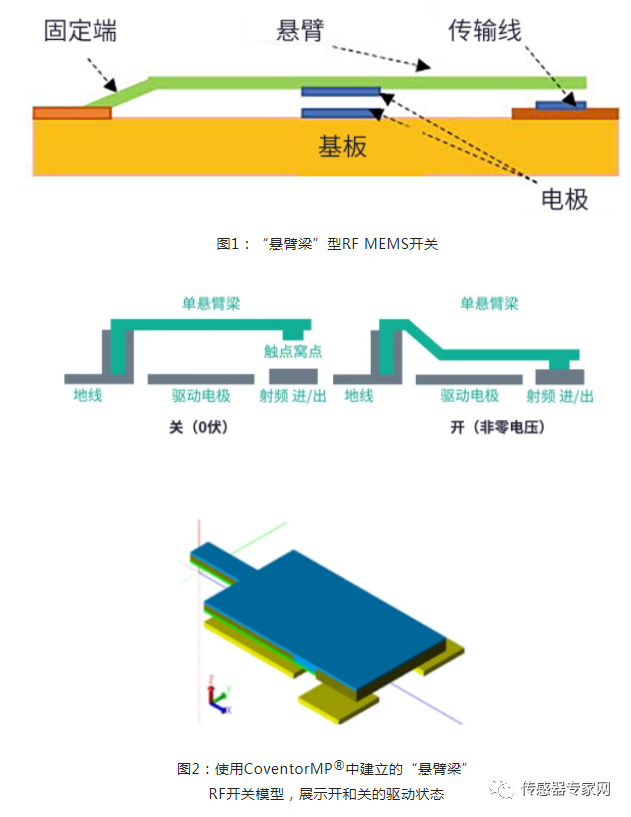 下图是“悬臂梁” RF MEMS开关。在这种配置中,固定梁悬挂在基板上,当梁被压下时,梁上的电极接触基板上的电极,将开关置于“开启”状态并接通了电路。