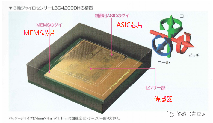 那MEMS传感器又是什么?MEMS传感器就是把一颗MEMS芯片和一颗专用集成电路芯片(ASIC芯片)封装在一块后形成的器件。
