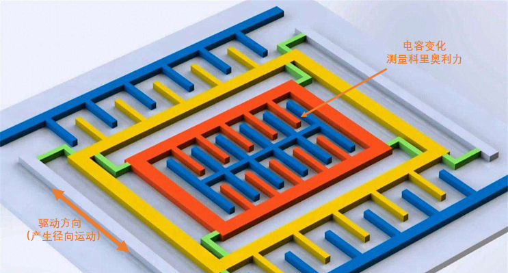 所以MEMS陀螺仪的结构,就是一个在圆盘上的物体块,被驱动,不停地来回做径向运动或者震荡。由于在旋转状态中做径向运动,因此就会产生科里奥利力。MEMS陀螺仪通常是用两个方向的可移动电容板,通过电容变化来测量科里奥利力。