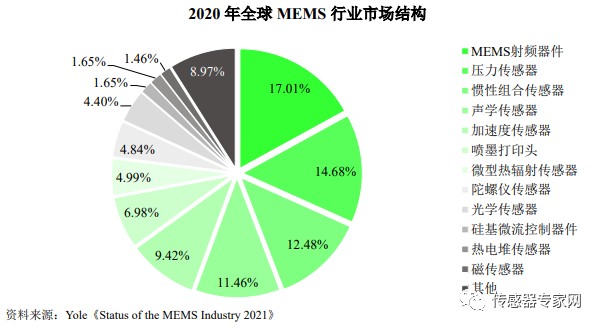 根据著名市场调研公司Yole的数据,全球最主流的MEMS器件分别是:MEMS射频器件、压力传感器、惯性组合传感器、声学传感器、加速度传感器、喷墨打印头、微型热辐射传感器、陀螺仪传感器、光学传感器、硅基微流控制器件、热电堆传感器、磁传感器。