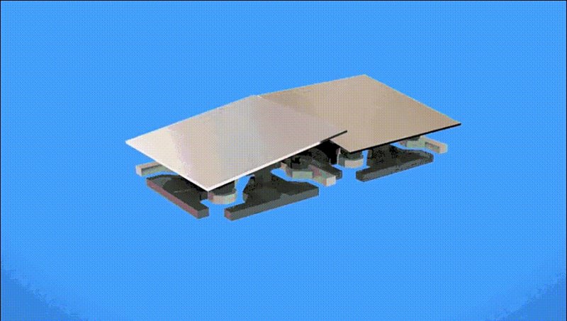 下图是DMD芯片里,每个微镜的运动情况,而这样的微镜,在一个DMD芯片里面数以百万计,每一面反射镜都可以独立反转运动,正负方向翻转,每秒钟翻转次数高达数万次。