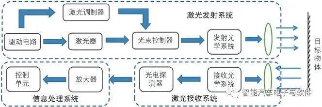 不同类型的激光雷达结构略有差异,但都主要由激光发射系统、激光接收系统、信息处理系统和扫描系统四大部分组成。激光发射系统中的驱动电路周期性的驱动激光器发射激光脉冲,通过激光调制器的光束控制器调整发射激光的方向及线数,再由发射光学系统发射激光;经接收光学系统,光电探测器接收目标物体反射的激光信号,并将信息传递至信息处理系统;信息处理系统经过放大处理及数模转换,由控制单元计算分析获取目标表面形态、物理属性等特征,建立物体模型;扫描系统则是能够改变激光束的空间投射方向,能够以稳定的转速旋转对所在平面进行扫描,并产生实时平面图信息,实现激光雷达的3D