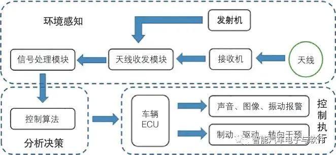 所示[5]。雷达天线向外发射毫米波信号,通过接收目标的反射信号,经信号处理模块获取车辆周边的环境信息,主要包括与探测物体间的相对距离、速度、角度及运动方向等;依据此信息进行目标跟踪和识别,结合车身信息状态,经车辆ECU