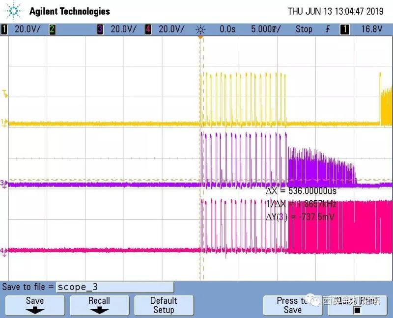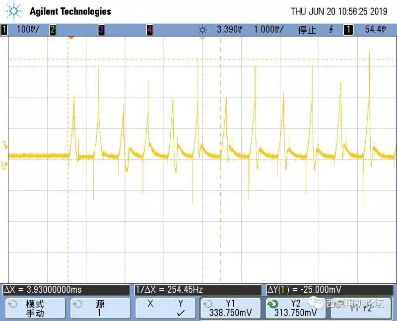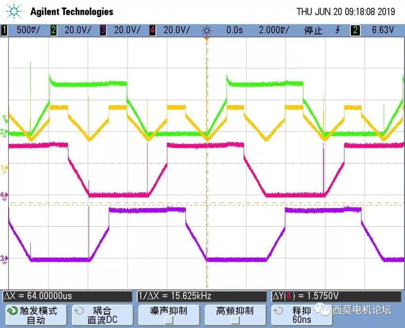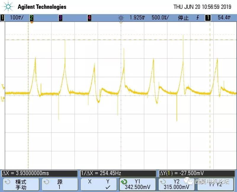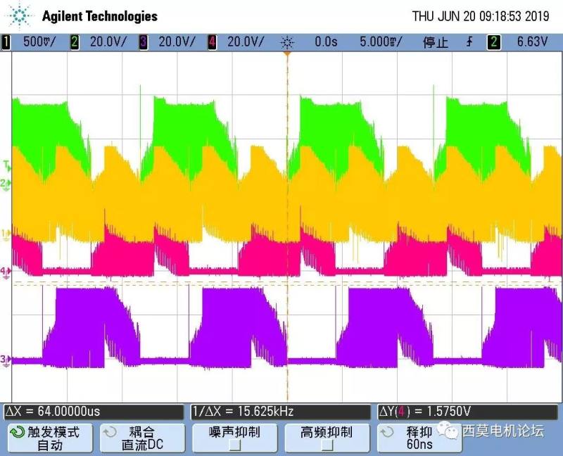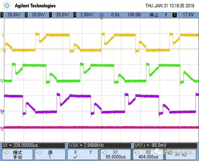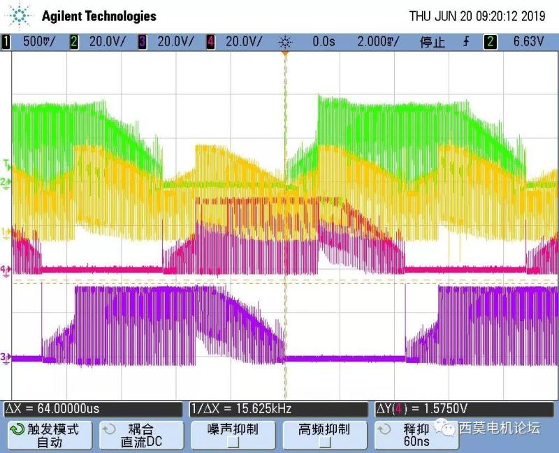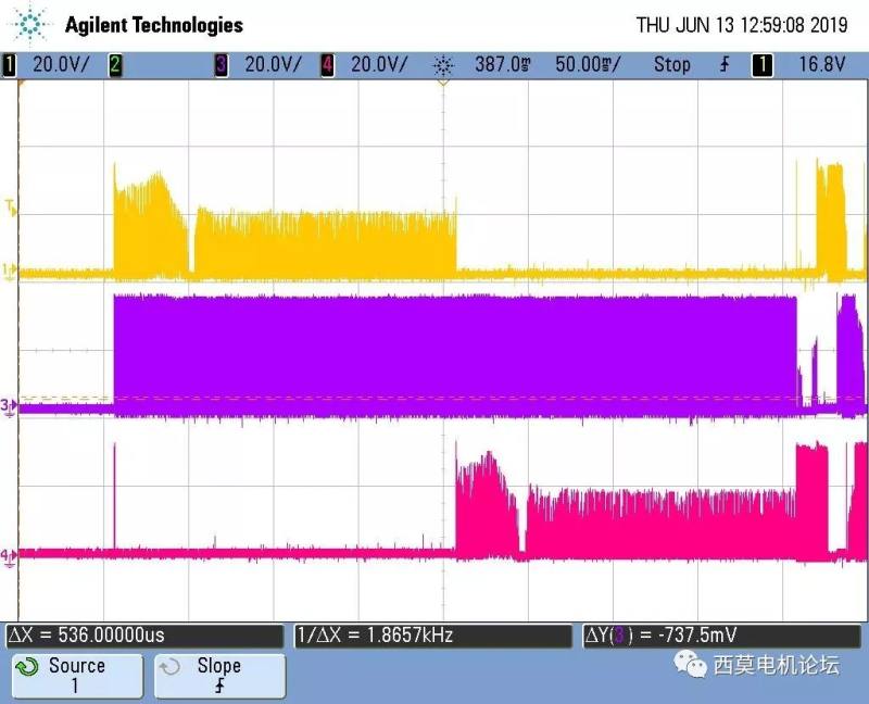 上图是某吸尘器电机全速运行波形,可以看出上升沿和下降沿的换相时刻都很好,续流时刻也很明显,需要尽量避免误判过零点。