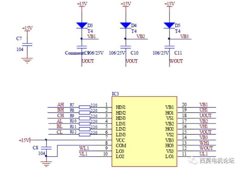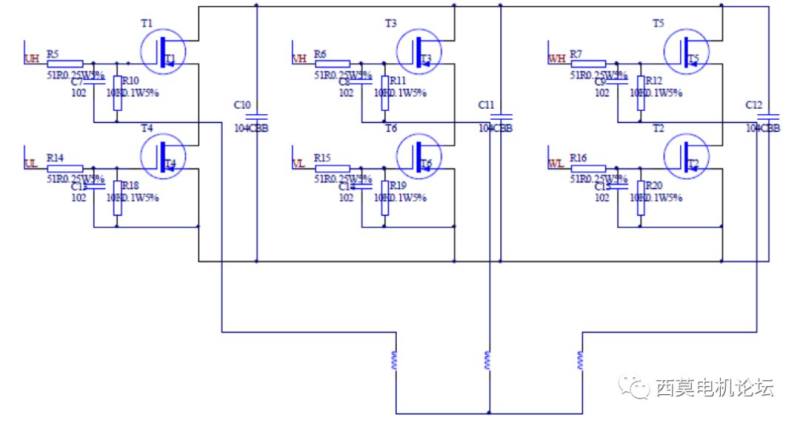 无刷直流电机控制系统不仅仅包括电机本体,还包括驱动电路和逆变器,图5给出电力逆变器电路,电机简化为三个电感器件,采用Y连接;图6给出预驱电路。