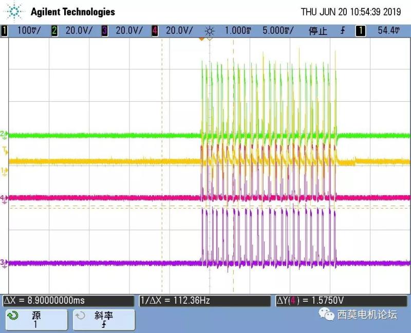 图19中,绿色红色和紫色是三相反电势波形图,黄色的是中性点电压(也就是图9中的NEUTRAL点电压,由于采样点是分压之后的,所以幅值很小),从图中可以观察出出现了不正常的平顶状态,这是因为黄色波形应该是三相反电势叠加在一起之后的中性点波形,正常一个是电源电压一个是地,另一个反电势在增加或者减小,但是由于图中的换相时刻稍微早了一点,所以看最左边的绿色平顶波形,明显早了,所以出现了两个母线电压和一个地的情况,所以这个波形就是换相早导致的,但是波形看起来还是很梯形的。下面把上图19的电机在加速过程中的波形发出来,可以看出来,一直都很接近梯形波,但是换相一直稍微早一点,所以此时程序需要适当的调整一下。