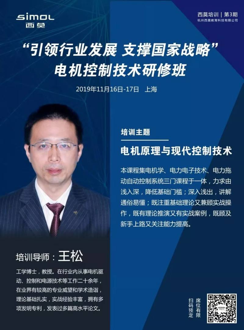 由电机控制专家王松教授主讲的“电机原理与现代控制技术”研修班11月16日上海站报名火热进行中!扫描(长按识别)下方二维码报名或了解培训详情