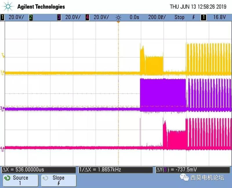 方波换相什么时刻最好一直是工程师研究的问题,下面用几个波形来简单说明一下,先看图19,